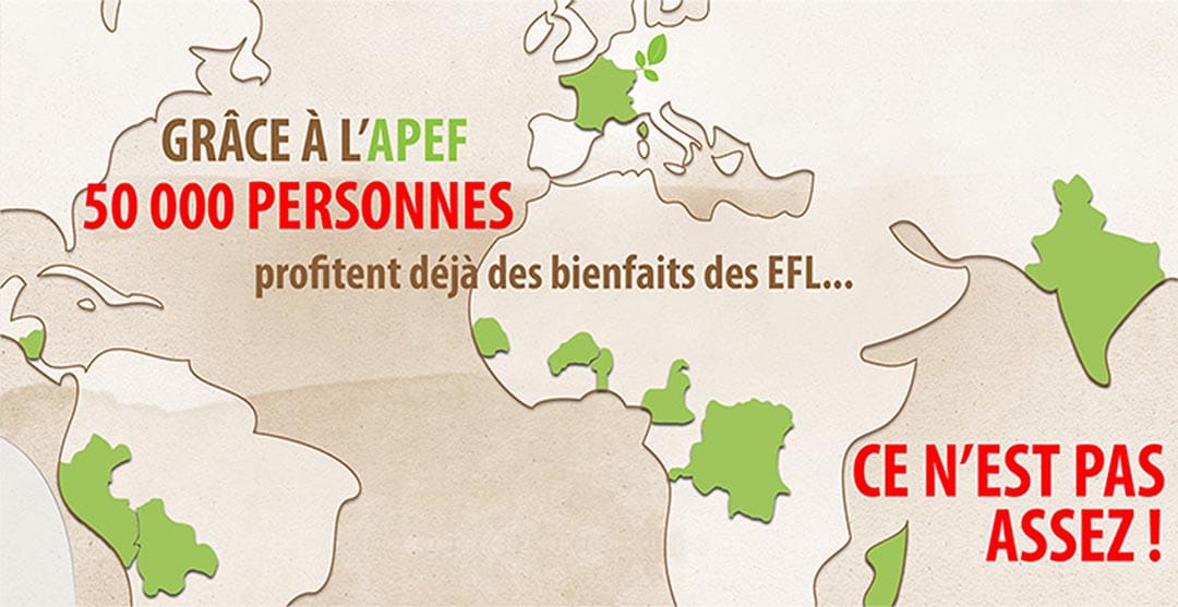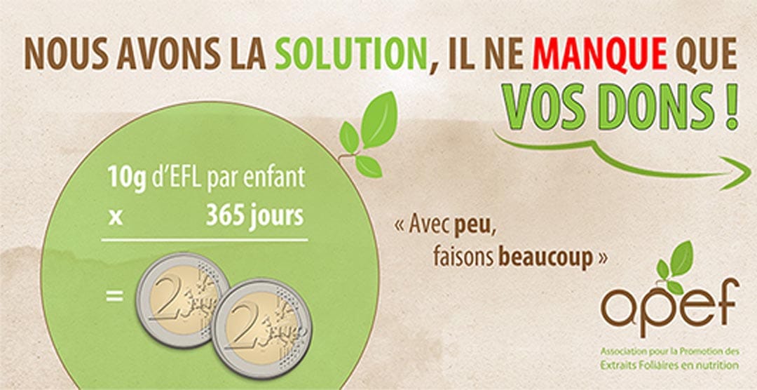 Soutenez l’action de l’APEF, l’Association pour la Promotion des Extraits Foliaires en nutrition, qui lutte contre la malnutrition dans le monde grâce aux extraits foliaires, en réalisant un don ou en rejoignant l'association.